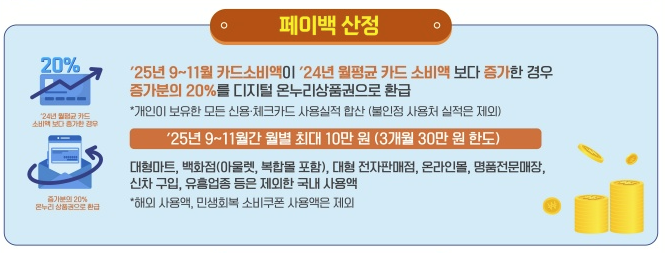 2024년 월평균 카드 소비액을 기준으로 2025년 9월부터 11월까지 3개월간 늘어난 소비액의 20%를 디지털 온누리상품권으로 환급해 줍니다.